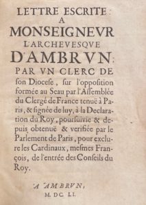 [MAZARINADE] — Lettre escrite a Monseigneur l'archevesque d'Ambrun, par un clerc de son diocèse, sur l'opposition formée au sceau, par l'assemblée du clergé de France tenuë à Paris, et signée de luy, à la déclaration du roy... pour exclure les cardinaux, mesmes françois, de l'entrée des Conseils du roy. Ambrun, s.n.,