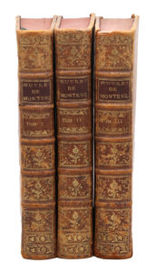 1767. 3 volumes in-4, veau marbré, dos orné, tranches rouges (Reliure de l'époque).Édition faite sur celle de 1758, établie sur les manuscrits de l'auteur par Richer et corrigée par Moreau, l'ancien secrétaire de Montesquieu, mais augmentée des Lettres familières.