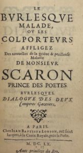 [SCARRON] — Le Burlesque malade, ou les colporteurs affligés des nouvelles de la griève et périlleuse maladie de Monsieur Scarron, prince des poètes burlesques. Paris, Jean-Baptiste Loyson, 1660. – La Pompe funèbre de Monsieur Scarron.