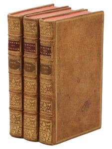 Bouillon, Société typographique, 1778. 3 volumes in-8, veau moucheté, triple filet doré, dos orné, tranches rouges (Reliure de l'époque).Une des plus jolies éditions illustrées des romans de Voltaire.