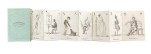 Paris, Marcilly, s.d. [1834]. Leporello in-32 (65 x 45 mm), cartonnage gaufré de l’éditeur. Très rare abécédaire miniature composé de 27 volets ornés de vignettes gravées pliés en leporello.
