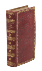 1818. In-18, maroquin rouge à long grain, dentelle dorée, dos lisse orné, dentelle intérieure, tranches dorées (Reliure de l'époque).Intéressant annuaire des corps de métiers du bâtiment : administrations, écoles, architectes, artisans, fabricants et marchands de matériaux. Il a paru de 1808 à 1830.