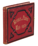In-8 oblong, percaline rouge, décor en noir, titre doré sur le plat supérieur, dos lisse, tranches dorées (Album de l'époque).Recueil de 20 photographies de P. Loubère en tirage albuminé détaillant les ruines de Paris après le siège et la Commune de 1870-1871.