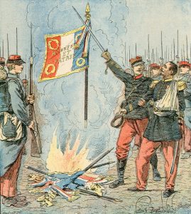 Français et Allemands. Histoire anecdotique de la guerre de 1870-1871. Illustré de 121 gravures en couleurs (dessins dans le texte, cartes et plans). P., Garnier, 1891-1897, 4 vol. 4°, 952, 956, 978, 960 p., demi-basane brune de l'époque, dos à 5 nerfs, auteur, titre et fleurons dorés (mors lég. frottés, 1 p. déchirée sans manque). Par Georges Hardouin (1846-1893), écrivain, journaliste et dessinateur français spécialisé dans l'histoire militaire, ancien du régiment des guides de la Garde Impériale, connu sous le pseudonyme de Dick de Lonlay.