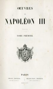 Oeuvres. P., Henri Plon, Aymot, 1856-1869, 5 vol. grand in-8, (4)-480, (4)-546, (4)-437, (4)-424, (4)-448 p., demi-chagrin rouge à coins du 19e s., dos à 5 nerfs, titre et tomaison dorés (coins usés, lég. rousseurs). 1. L'Idée napoléonienne.- 2. Mélanges.- 3. Discours et proclamations.- 4. Du passé et de l'avenir de l'artillerie.- Discours, proclamations, messages. Portrait de Napoléon III au tome 5, gravé par Morse d'après Flandrin. Exemplaire complet du très rare cinquième volume (Vicaire, VI, 37).