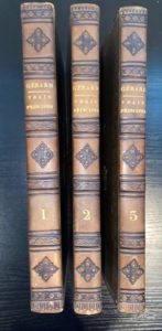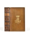 BERRY (duchesse de). – GÉRARD (Philippe-Louis). Essai sur les vrais principes, relativement à nos connoissances les plus importantes. Paris, J.-J. Blaise, 1826. 3 volumes in-8, (4)-xxiv-372 + (4)-331-(1 blanche) + (4)-320 pp., veau tabac, dos à nerfs orné à froid avec titre et tomaison en caractères dorés, roulette de palmettes à froid et filet noir encadrant les plats avec fleurons d'angles dorés et chiffre « CM » couronné doré au centre, coupes ornées à froid, roulette de chaînette noire encadrant les contreplats, tranches marbrées ; quelques mouillures marginales dans le premier volume, rousseurs (reliure de l'époque). ÉDITION ORIGINALE. 3 planches gravées sur cuivre : un portrait par Claude-Marie-François Dien, et un fac-similé d'écriture sur 2 feuillets par Félix-Antoine Dien. Essai de philosophie morale et naturelle par l'abbé Gérard (1737-1813) s'inscrivant, comme son roman à succès Le Comte de Valmont, ou les Égaremens de la raison (1775-1778), dans une démarche apologétique en faveur de la religion face aux Lumières. EXEMPLAIRE AU CHIFFRE COURONNE DE LA DUCHESSE DE BERRY (OHR, pl. n° 2554, fer n° 6 en grand format), avec vignette ex-libris de son château de Rosny gravée à ses armoiries sur les contreplats supérieurs.