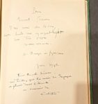 COLETTE (Sidonie Gabrielle). La Treille muscate. S.l.n.n. (texte imprimé par Aimé Jourde, estampes tirées par Vernant et Brunel), 1932. Grand in-4, (4 blanches)-86-(12 dont les 3 dernières blanches) pp., maroquin vert, dos lisse, décor couvrant les plats et le dos, formé d'un treillis de filets dorés avec triples motifs circulaires concentriques dorés et vrilles de vigne noires, doublures en bord à bord et gardes de veau blanc ornées d'un semis de vrilles de vigne dorées, tranches dorées, couvertures et dos conservés, chemise à dos et rabats de maroquin vert, étui bordé ; cuir légèrement foncé aux mors, chemise et étui frottés (G. Cretté succ. de Marius Michel). Édition tirée à 165 exemplaires numérotés sur vélin de hollande (le n° 129). Colette acheta en 1926 la propriété de « La Treille Muscate », près de Saint-Tropez, y vint en villégiature jusqu'en 1938, et publia un recueil du même nom en 1932. ILLUSTRATION GRAVEE SUR CUIVRE PAR ANDRE DUNOYER DE SEGONZAC, qui a œuvré à la gravure dans la maison même de Colette, soit : 36 compositions dont 18 à pleine page comprises dans la pagination. DOUBLE ENVOI AUTOGRAPHE SIGNE DE L'AUTEUR ET DE L'ARTISTE : « Pour Ernest Simon, vrai ami des livres, avec toute ma sympathie et ma très vive reconnaissance. A. Dunoyer de Segonzac. Juin 1942 » « Pour Ernest Simon, une "Treille" que la main de Segonzac a placée dans l'éternité, en souvenir de Colette. » EXEMPLAIRE ENRICHI D'UN DESSIN ORIGINAL représentant la maison de Colette, avec LEGENDE AUTOGRAPHE SIGNEE d'André Dunoyer de Segonzac : « Pour La Treille muscate de Colette... » (encre de chine et plume, 30 x 24 cm). Provenance : François Ragazzoni (vignette ex-libris).