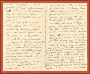 PISSARRO (Camille). Lettre autographe signée à sa nièce Alice Isaacson. Paris, 29 juin 1889. 4 pp. in-8, liseré de deuil ; encadrement sous verre biface avec portrait photographique. « Ma chère Alice, en attendant une longue lettre d'Esther me mettant au courant des petites affaires concernant Georges, de son plan de conduite et d'études, je t'écris pour te mettre au courant des affaires de la succession, simplement pour avoir ton avis, car avec ton bon sens et ta grande équité, tu remets les choses dans leur juste place. Je crains bien que malgré l'expérience de ton père nous n'arrivions à rien de bon, nous avons affaire à des gens sans scrupule et qui sont, je pense, décidés à éluder cette affaire. Entre nous soit dit, si Marie était honnête, ne nous aurait-elle pas déjà réglé cette affaire ? Sans y mêler même son mari, lui évitant tous les ennuis & les remords. Au contraire n'a-t-elle pas déjà dit à Amélie et même, je crois, persuadée que nous ne pouvions rien réclamer, notre père étant associé devait supporter les pertes. Vois-tu grand-père déshéritant ses enfants pour favoriser un seul comme je l'ai dit à Amélie, ce n'est pas possible que Marie puisse se figurer cela. Qu'en dis-tu ?... Autre chose. Je suis certain d'avoir vu dans le temps l'acte d'association dans les papiers de ma mère. Nous avons eu beau fouiller partout, rien... Qu'est devenu ce document ? Sans lequel pas de réclamation possible. J'espère que ton père saura trouver le moyen de se procurer ce papier. Cela m'ennuie bien de m'occuper de toutes ces choses, mais cela me paraît prendre une tournure louche. Il me semble que si Alfred [frère de Camille Pissarro] est honnête, il doit bien savoir si il [a] existé une association. Il sait que je suis dans la misère, pourquoi vouloir me frustrer. Est-il possible d'avoir si peu de cœur, cet atermoiement prouve bien leur mauvais dessein. Comme je pressentais bien ces gens ! J'ai bien hâte de quitter Paris pour aller à Éragny [sa maison à Éragny-sur-Epte, dans l'Oise] oublier ces misères, j'espère faire une petite affaire encore ces jours-ci et je partirai, du reste je vous préviendrai. J'espère que Georges est gentil avec vous, recommandez-lui sans en avoir l'air de soigner un peu plus son orthographe, sans en avoir l'air, il est fainéant pour chercher dans son dictionnaire. QUE DIT Mr H. BY (COMME IL ME L'ECRIT) [POUR ASHBEE], entrevoit-il quelque chose de bon pour lui ? À présent qu'Esther est débarrassée du fardeau de Pauquy [?] House (est-ce ainsi que cela se dit) qui pesait si lourdement sur ses épaules, à présent qu'elle ne bâtit plus de tour Eiffel en serviettes, elle aura le temps de penser aux amis, aussi j'attends une lettre brillante d'elle, et de toi, ma chère Alice, quelques lignes seulement, empreintes de ce grand calme et de cette justesse de vue qui te caractérise. JE REÇOIS A L'INSTANT UNE LETTRE DE GEORGES AVEC DES DETAILS SUR L'ECOLE, je suis bien heureux qu'il trouve cela à son goût. J'espère qu'il s'appliquer ferme et qu'il saura se faire aimer de SES MAITRES, SI DEVOUES ET INTELLIGENTS DES CHOSES D'ART. J'espère bien, quand je serai débarrassé de toutes mes petites ennuies, aller à Londres et faire la connaissance de Mr Ashbee... » L'ARCHITECTE CHARLES ROBERT ASHBEE, UN DES FONDATEURS DU MOUVEMENT ARTS AND CRAFTS, avait fondé à Toynbee Hall (à Londres), la Guild and School of Handicraft, où venait d'être admis un des fils de Camille Pissarro, Georges. SUCCESSION DE LA MERE DE CAMILLE PISSARRO. D'un premier mariage avec Isaac Petit, Rachel Manzana Pomié avait eu notamment une fille, Emma, puis s'était remariée avec Frédéric Abraham Gabriel Pissarro, dont elle avait eu notamment le peintre Camille Pissarro. Emma avait à son tour épousé Phineas Isaacson, négociant aux Antilles (comme le père de Camille) dont elle avait eu notamment Alice, Esther, Amélie, Marie et Alfred. En 1889, un fils de Camille Pissarro, Georges, vivait chez les Isaacson à Londres, et allait bientôt épouser Esther.