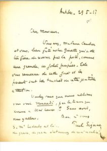SIGNAC (Paul). Lettre autographe signée [au peintre belge Louis-Gustave Cambier]. Antibes, 29 mai 1917. 1 p. in-folio sur vergé fin. « Vous avez, madame Cambier et vous [l'épouse de Louis-Gustave Cambier, Juliette Ziane, était également artiste peintre], bien gâté notre Ginette [fille de Paul Signac], qui a été très fière de recevoir par la poste, comme une grande, ces jolies poupées. Elle vous remercie de cette joie et les parents sont très touchés de cette gentille attention. Voulez-vous que nous allions vous voir mercredi, par le train qui arrive à trois heures ? Sans avis, nous y allons... Si Mr Ledoulx est là... de grâce, de grâce, détournez de moi ce calice ! »