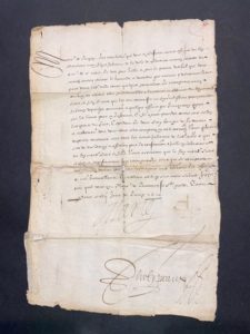 MARIE DE MÉDICIS. Lettre signée « Marie » à Jean de Lauzon, trésorier général de France à Poitiers, contresignée par Paul Phélypeaux en qualité de secrétaire d'État. Paris, 12 juin 1614. Une p. in-folio, adresse au dos avec vestige de cachet, deux pliures entièrement fendues et restaurées au verso avec manque de quelques lettres, entailles propres au système de clôture. « J'ay receu la lettre que vous et plusieurs autres officiers du roy monsieur mon filz et habitans de LA VILLE DE POICTIERS m'avez escritte du xiiie de ce mois, et veu par icelle et par le procès-verbal que vous m'avez aussy envoyé LE TUMULTE ET DESORDRE que aucuns y desnommez ont faict dans ladicte ville de contre quelques particuliers. JE RECOGNOIS ASSEZ COMBIEN CES ACTIONS SONT PREJUDICIABLES A L'AUCTORITE ET SERVICE DU ROY mondict sieur et filz, si ceux qui les ont commises ne s'en justiffient promptement. JE FERAY DEPESCHER COMMISSION a quelque officier que j'envoyery exprés sur les lieux pour en informer, et faire aprés proceder contre eux selon l'exigence du faict. Cependant je vous sçay bon gré de la douceur et moderation dont vous vous estes comportez en ceste occasion, vous exhortant d'apporter tousjours avec tous les autres habitans de ladicte ville ce qui sera de vostre soing et affection pour la conservacion d'icelle en l'obeissance du roy mondict sieur et filz... » LE PRINCE DE CONDE EN ECHEC A POITIERS. Après l'assassinat d'Henri IV, sa veuve Marie de Médicis eut bientôt à faire face comme Régente à une révolte des Grands, toutes confessions confondues. Elle parvint à obtenir la défection de plusieurs d'entre eux, dont le prince de Condé, en concluant en mai 1614 la paix de Sainte-Ménéhould. Cependant, le même Condé voulut dès juin 1614 se rendre maître de Poitiers en essayant de peser sur l'élection du maire, assuré qu'il se croyait de la sympathie du gouverneur, le duc de Roannez. L'évêque de Poitiers, Henri-Louis Chasteigner de La Roche-Posay, prit des mesures énergiques pour faire échouer cette manœuvre et fit même enfermer un temps le duc de Roannez. Un émissaire de Condé fut molesté par une foule furieuse, et le prince lui-même se vit interdire l'entrée de la ville. Des mouvements de troupes royales, des enquêtes pour la forme à Poitiers, et de nouvelles négociations avec le prince permirent alors d'éviter une situation de guerre.