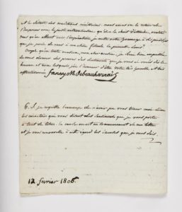 BEAUHARNAIS (Marie-Anne-Françoise Mouchard de Chaban, dite Fanny de). Lettre signée et datée de sa main, au comte Godefroy de La Tour-d'Auvergne. S.l., 12 février 1806. 2 pp. in-4, adresse au dos avec vestige de cachet de cire rouge à ses initiales. « ... Mr ET MAD[AM]E MURAT sont en parfaite santé. Je compte les voir ce soir dans ma loge. Leur fils est le plus joli du monde... Nous avons vu le retour de L'EMPEREUR avec le juste enthousiasme qu'il a le droit d'attendre. Voulez-vous qu'en allant voir L'IMPERATRICE je mette votre hommage à ses pieds, et que je parle de vous à ma chère filleule la princesse Louis [Hortense de Beauharnais] ?... » Elle évoque également plusieurs de leurs connaissances communes. PARENTE DE L'IMPERATRICE JOSEPHINE ET MARRAINE D'HORTENSE, FANNY DE BEAUHARNAIS naquit Marie-Anne-Françoise Mouchard de Chaban, et épousa en 1753 Claude de Beauharnais, comte Des Roches-Baritaud, dont elle se sépara en 1762. Elle se distingua par son goût pour les lettres, écrivant elle-même, et tenant salon à son domicile de Fontainebleau. Napoléon Ier adopta sa fille Stéphanie et en fit une grande-duchesse de Bade.