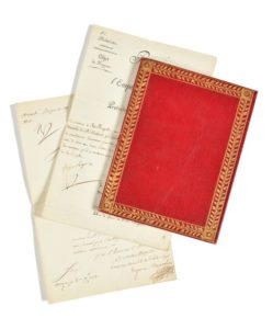 NAPOLÉON Ier. 2 apostilles, l'une autographe signée, l'autre signée, sur 2 pièces manuscrites à lui adressées, avec deux pièces imprimées dont une reliée. 1806-1808 et s.d. – NAPOLEON Ier. Apostille autographe signée « Np » (Paris ou Saint-Cloud, août 1808, 3 mots), sur une pièce signée à lui adressée par Ferdinando MARESCALCHI en qualité de ministre des Affaires étrangères du royaume d'Italie (Paris, 16 août 1808, 2 pp. in-folio). Ferdinando Marescalchi fait ce rapport à l'empereur : « Je prends la liberté de mettre sous les yeux de Votre Majesté une pétition qu'a l'honneur de lui adresser Mr Buttura, employé dans mon ministère. Mr Buttura se propose de publier un recueil de ses ouvrages, dans lesquels il a eu pour but de célébrer la gloire de Votre Majesté. Il voudrait en faire une édition digne du sujet qu'il a traité, mais ses moyens pécuniaires ne le lui permettent pas. Mr Buttura ose recourir à la munificence de Votre Majesté. Il ne m'appartient pas d'indiquer des bienfaits à Votre Majesté ; mais je crois pouvoir me permettre de l'assurer que, par celui que sollicite Mr Buttura, s'il était assez heureux pour l'obtenir, Votre Majesté, en secourant un homme de lettres peu fortuné, récompenserait un réel talent... » De sa main, Napoléon Ier répond : « Renvoyé à Eugène... » – NAPOLEON Ier. Apostille signée « Np » (Burgos, 19 novembre 1808, un mot), sur une lettre à lui adressée par son fils adoptif EUGENE DE BEAUHARNAIS en qualité de vice-roi d'Italie (palais de Monza, près de Milan, 8 novembre 1808, une p. in-folio). Le prince Eugène écrit : « Votre Majesté a daigné me faire l'honneur de me communiquer la demande de M. Buttura, employé au ministère des relations extérieures de son royaume, lequel a recours à la munificence de Votre Majesté pour faire une bonne édition des ouvrages qu'il a consacrés à sa gloire. Je pense que Votre Majesté pourrait accorder à M. Buttura une somme de 2400 f. qui seraient pris sur les fonds du ministère des Relations extérieures... » Napoléon Ier répond : « Accordé... » L'ouvrage fut imprimé par Armand-Louis-Jean Fain en 1809, sous le titre Poesie liriche consecrate a Napoleone il Grande. – BUTTURA (Antonio). Nel primo compleanno dell'incoronazione a re d'Italia di Napoleone il Grande. Cantata. [« Au premier anniversaire du couronnement comme roi d'Italie de Napoléon le Grand. Cantate »]. [Paris], s.n., [mai 1806]. Plaquette in-4, (2 blanches)-7-(3 blanches) pp. sur papier vélin, maroquin à long grain rouge, dos orné de filets et motifs végétaux dorés, large encadrement doré sur les plats comprenant une frise de lauriers entre filets avec étoiles rayonnantes aux angles, roulette intérieure dorée, doublures et gardes de tabis bleu ; mouillure sur le plat supérieur avec petit accroc, manque marginal aux feuillets (reliure de l'époque). ÉDITION ORIGINALE. Pièce de vers faisant dialoguer Apollon et l'Italie au sujet du règne de Napoléon Ier en Italie, composée, comme indiqué au titre, « pour la fête célébrée en telle occasion par S.E. Ferdinando Marescalchi, ministre des Relations extérieures du royaume d'Italie » (« per la festa celebrata in tal occasione da S.E. Ferdinando Marescalchi, ministro delle Relaioni estere del regno d'Italia »). Elle fut intégrée en 1809 dans le recueil Poesie liriche consecrate a Napoleone il Grande qui fait l'objet de la correspondance ci-dessus. BELLE RELIURE DE JEAN-CLAUDE BOZERIAN, non signée mais reconnaissable à ses fers. – BUTTURA (Antonio). La Nascita di Giove. [Paris], dai torchi di P. Didot maggiore in agosto 1808. 3 pp. sur un bifeuillet in-8 de papier vélin, en feuille ; quelques rousseurs. D'abord parue dans le Mercure de France du 17 septembre 1808, cette pièce de vers à la gloire de Napoléon Ier fit l'objet de la présente édition, puis fut intégrée dans le recueil Poesie liriche consecrate a Napoleone il Grande. ANTONIO BUTTURA, ITALIEN ACQUIS A LA FRANCE ET A LA CAUSE DE NAPOLEON Ier. Chef du parti pro-français à Vérone lors de la première campagne d'Italie de Bonaparte, il gagna la France après le traité de Campo-Formio, et y enseigna l'italien, notamment au Prytanée militaire de Saint-Cyr. Après un bref retour en Italie comme professeur au lycée de Mantoue, il fut chargé de la conservation des archives du ministère des Affaires étrangères du royaume d'Italie dont le siège était situé à Paris, poste qu'il occupa jusqu'à la fin de l'Empire, hormis une brève mission comme consul de France en Illyrie. Il demeura ensuite en France jusqu'à sa mort en 1832, poursuivant ses activités d'enseignant à l'Athénée royal de Paris. Il publia un dictionnaire italien-français, diverses traductions, des éditions d'auteurs italiens, et des poésies à la gloire de la France et de Napoléon Ier. Provenance : Ferdinando Marescalchi.