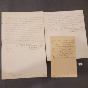 FRÉDÉRIC-GUILLAUME III DE PRUSSE. 2 lettres signées « Frédéric Guillaume », chacune avec 3 lignes autographes, adressées A NAPOLEON Ier. 1809. – Königsberg [alors en Prusse orientale, actuellement Kaliningrad en Russie], 4 octobre 1809. « Monsieur mon frère, LA REINE MON EPOUSE AYANT ETE HEUREUSEMENT DELIVREE AUJOURD'HUI D'UN PRINCE, je m'empresse de faire part à Votre Majesté Impériale & Royale de cet agréable événement, auquel je ne doute point qu'Elle ne veuille prendre quelque intérêt. Je souhaite de mon côté de trouver de fréquentes occasions de témoigner à Votre Majesté Impériale & Royale les sentimens de la parfaite estime & amitié que je lui ai voués et avec lesquels je ne cesserai d'être, [de la main du roi de Prusse :] Monsieur mon frère, de Votre Majesté Impériale et Royale, le bon frère et ami Frédéric Guillaume » (1/2 p. in-4). – Berlin, 26 décembre 1809. « Monsieur mon frère, AYANT JUGE A PROPOS DE RAPPELER DE PARIS LE MINISTRE D'ÉTAT BARON DE BROCKHAUSEN QUI A EU L'HONNEUR D'Y RESIDER JUSQU'A PRESENT en qualité de mon envoyé extraordinaire et ministre plénipotentiaire près Votre Majesté Impériale et Royale, je ne diffère pas de la prévenir de cette détermination [Karl-Christian von Brockhausen représentait le roi de Prusse à Paris depuis le traité de Tilsit]. Je la prie de vouloir bien permettre à ce ministre de se congédier d'Elle et recevoir de lui à cette occasion l'expression réitérée de mes sentimens pour Elle, et des vœux constans que je forme pour sa satisfaction et son bonheur. Je serai très empressé, Sire, à remplir l'honorable mission que le baron de Brockhausen occupoit et je ne demande qu'à faire pour cet effet un choix qui soit agréable à Votre Majesté Impériale et Royale, désirant vivement qu'Elle veuille y trouver une nouvelle preuve de mon amitié parfaite, de mon invariable attachement aux relations intimes qui m'unissent à Elle, et de la haute estime et considération, avec laquelle je suis, [de la main du roi de Prusse :] Monsieur mon frère, de Votre Majesté Impériale et Royale, le bon frère et ami Frédéric Guillaume » (2/3 p. in-folio). JOINT, DU MEME, un billet autographe à la comtesse de Saint-Aulaire. S.l., « ce 3 à huit heures du matin ». « J'étais tellement tourmenté hier d'un violent rhumatisme à la tête qu'il m'a été impossible de venir prendre congé de vous. Je pars avant onze heures. Me permettrez-vous peut-être de venir me présenter chez vous vers dix heures ?... »