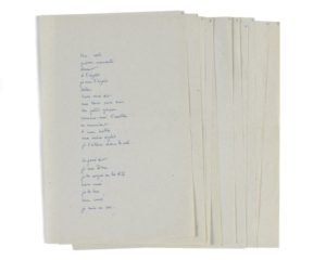 BATAILLE (Georges). Manuscrit autographe intitulé « La tombe de Louis XXX ». 13 ff. in-8 foliotés 1 à 13 avec feuillet n° 12 demeuré blanc, soit : un feuillet de faux-titre (« La tombe »), un feuillet de titre et 10 poèmes . SUITE POETIQUE IMPREGNEE D'UN EROTISME MORBIDE, SCATOLOGIQUE, ANTICLERICAL. Probablement composée entre 1942 et 1945, elle est à mettre en rapport avec deux autres textes de la même période, Le Petit (publication en 1943 sous le pseudonyme de « Louis Trente »), et Le Mort (publication posthume en 1964). Georges Bataille retravailla encore « La tombe de Louis XXX » en 1954, lui faisant subir ajouts et retranchements, mais ne la livra pas à la publication : elle ne paraîtrait qu'en 1971 dans les Œuvres littéraires posthumes (Œuvres complètes, vol. IV, Gallimard). « Ma fêlure est un ami aux yeux de vin fin et mon crime est une amie aux lèvres de fine je me branle de raisin me torche de pomme. » xxx La blessure est fraîche elle défigure le rouge ruisselle la coupure bande il n'y a plus d'œil c'est moi. »