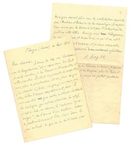 BERGSON (Henri). 2 lettres autographes signées [au critique littéraire et historien Albert Thibaudet]. Éloge du Platonisme et critique du « mauvais intellectualisme » aristotélicien – Saint-Cergue [canton de Vaud, en Suisse], 4 septembre 1923. « Je viens de lire vos "Conclusions sur le bergsonisme" [parue dans le numéro de septembre 1923 de La Nouvelle revue française] et je veux vous dire tout de suite combien je les trouvent intéressantes et attachantes. Il était impossible de caractériser avec plus de pénétration et de force ce que j'ai cherché à faire, – ce que je ne suis pas sûr, hélas, d'avoir complètement fait. Il me semble que votre méthode habituelle de critique qui est de chercher la clef (c'est-à-dire, en somme, le "schème dynamique") de l'œuvre d'un auteur, vous a particulièrement bien servi dans le cas actuel. Ce qui m'a intéressé par-dessus tout, c'est ce que vous dites de Socrate, de Platon, et de la continuité de développement de la philosophie "dialoguée". Comme vous le faites très justement remarquer, c'est un certain aspect, C'EST UNE CERTAINE INTERPRETATION DE PLATON QUE J'ISOLE QUAND JE DISCUTE LE PLATONISME DANS "L'ÉVOLUTION CREATRICE" [ouvrage publié par Henri Bergson en 1907] : CETTE INTERPRETATION EST CELLE D'ARISTOTE, celle qui, transmise à travers le Moyen Âge, se trouve aujourd'hui encore au fond de ce QUE J'APPELLERAIS LE MAUVAIS INTELLECTUALISME. Si Platon était là tout entier, je ne comprendrais pas LA SYMPATHIE PROFONDE QUE J'AI TOUJOURS EUE POUR LE PLATONISME ET SURTOUT POUR LE NEO-PLATONISME : IL N'Y A PAS DE PHILOSOPHE QUE JE PREFERE A PLOTIN. Donc, ici encore, vous devez avoir raison. Ayant lu vos "Conclusions sur le bergsonisme", je suis plus impatient encore de connaître "Le Bergsonisme" lui-même [Albert Thibaudet publierait son étude Le Bergsonisme en 1923]... » (3 pp. 1/3 in-12). Matière et mémoire – Grand-Hôtel à Vevey [dans le canton de Vaud] en Suisse, 5 septembre 1934. « Vous avez peut-être lu, dans le numéro du 1er août de La Nouvelle revue française, UN ARTICLE DE M. LE SAVOUREUX [le psychiatre Henri Le Savoureux, qui tenait un salon littéraire dans la maison de santé qu'il avait fondée à La Vallée-aux-Loups, l'ancienne propriété de Chateaubriand] INTITULE "BERGSONISME ET NEUROLOGIE". CET ARTICLE ESSENTIELLEMENT MALVEILLANT, CHERCHE A ETABLIR QUE DANS "MATIERE ET MEMOIRE" [ouvrage publié par Henri Bergson en 1896] JE ME SUIS BATTU CONTRE DES MOULINS A VENT et que je n'ai apporté aucune contribution nouvelle à la théorie de l'aphasie, pas plus d'ailleurs qu'à la psychiatrie en général, sur laquelle j'aurais disserté a priori en métaphysicien pur. Il est évident que l'auteur – bien que médecin, m'a-t-on dit – n'est au courant ni des idées généralement admises par les théoriciens de l'aphasie entre 1880 et 1900, ni de ce qui a été fait depuis dans ce domaine si important, notamment par [Henry] Head en Angleterre, par [Constantin] von Monakow à Zurich, etc. etc. Ce dernier, célèbre dans le monde entier comme neurologiste aussi bien que comme anatomiste, a porté sur "Matière et mémoire" un jugement sensiblement différent de celui de M. Le Savoureux... » Henri Bergson indique ensuite qu'un droit de réponse en sa faveur fut adressé à la Nrf par le docteur Raoul Mourgue, personnalité citée dans « Bergsonisme et neurologie » dont il affirme que « personne, à ma connaissance, ni en Europe ni en Amérique, n'a une érudition neurologique et psychiatrique supérieure... à la sienne ». Ce droit de réponse n'ayant pas été publié dans le numéro de septembre, Henri Bergson demande ici à Albert Thibaudet, collaborateur régulier de la Nrf, de bien vouloir intervenir pour qu'il paraisse enfin. Il le serait en effet dans le numéro d'octobre de la Nrf, mais le docteur Le Savoureux y répondrait encore dans le numéro de novembre (3 pp. 3/4 in-8).