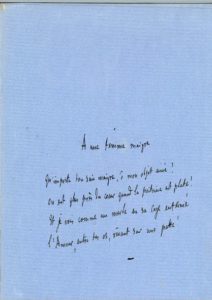 FLAUBERT (Gustave). Manuscrit poétique autographe intitulé « À une femme maigre ». 4 vers occupant une p. in-4 oblong sur un bifeuillet de papier bleu.UN POEME DE LOUIS BOUILHET COPIE DE LA MAIN DE FLAUBERT.« Qu'importe ton sein maigre, ô mon objet aimé ?On est plus près du cœur quand la poitrine est plate !Et je vois comme un merle en sa cage enferméL'Amour, entre tes os, rêvant sur une patte ! »Gustave Flaubert publia ce poème en 1872 dans les notes annexées au volume des Dernières chansons de Louis Bouilhet, sous le titre « À une jeune fille manquant de charme ». Il y adjoignit la remarque suivante : « Bouilhet avait fait beaucoup de vers de ce genre-là et de plus salés ». Dans sa préface, il indiqua de manière plus générale que « rien n'empêche d'avouer qu'il excellait aux épigrammes, quatrains, acrostiches, rondeaux, bouts-rimés et autres "joyeusetés" faites par distraction, comme débauche. Il en faisant aussi par complaisance [...] Il avait le don de l'amusement, chose rare chez un poète. »Guy de MAUPASSANT cite ce quatrain dans le conte « Nos Anglais », qu'il publia dans le journal Gil Blas du 10 février 1885, puis dans son recueil Toine en janvier 1886.LOUIS BOUILHET, QUE GUSTAVE FLAUBERT APPELAIT « MA CONSCIENCE LITTERAIRE », fut un de ses plus proches amis (il fut également l'ami de Guy de Maupassant). Conservateur à la bibliothèque de Rouen, il joua un rôle important auprès de lui en lui dispensant des conseils concernant ses œuvres. Écrivain lui-même, il est l'auteur de pièces de théâtre et de poésie. Après sa mort en 1869, Gustave Flaubert œuvra à servir sa mémoire : il retravailla une pièce retrouvée dans les papiers du défunt, Le Sexe faible, fit jouer et imprimer une autre pièce de celui-ci, Mademoiselle Aissé, et publia avec préface personnelle ses poésies posthumes sous le titre Dernières chansons (1872).