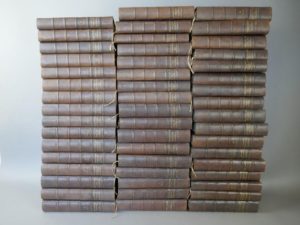 Balzac (Honoré de) - Œuvres complètes illustrées. Paris, société d'éditions littéraires et artistiques, Ollendorff 1900/1928. 50 volumes in-8°, reliure d'époque en demi-chagrin bordeaux foncé à coins, têtes dorées, dos quelques peu insolés tirant sur le marron. Couvertures conservées, nombreuses illustrations en noir sous serpentes légendées. Divers illustrateurs dont : Adrien Moreau, Toudouze, Albert Linch, Robaudi, Gaston Bussière... Piqûres sur les tranches, beaucoup plus rares sur les feuillets. Reliure poussiéreuse, mérite juste un nettoyage. Aucun défaut notable de la reliure excepté quelques coins émoussés. Série bien complète de ses 50 volumes.