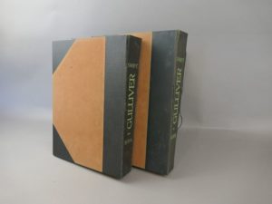 Bofa Gus - Swift Jonathan - Voyages de Gulliver. Bruxelles aux éditions du Nord, 1929. 2 volumes brochés in-4° sous chemises et étuis de l'éditeur. Défauts d'usage aux chemises. Ouvrage peu courant tiré à seulement 360 exemplaires celui-ci porte le n°213. Rousseurs éparses plus prononcées sur les serpentes et certaines eaux-fortes.