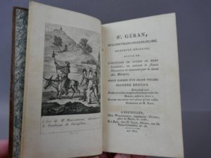 Cadet de Gassicourt (Charles-Louis) - St. Géran, ou la nouvelle langue française, anecdote récente ; suivie de l'itinéraire de Lutèce au Mont-Valérien, petite parodie d'un grand voyage. Bruxelles, chez Weissenbruch, 1812. 1 volume in-12, reliure d'époque en plein veau raciné, dos lisse avec fleurons dorés et titre. Petits frottements d'usage, bon exemplaire de cette parodie de Chateaubriand et de Mme de Staël. Joli frontispice gravé.
