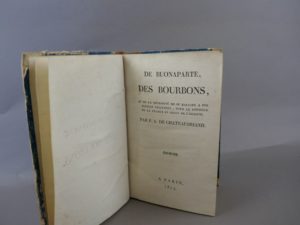 Chateaubriand (François-René de) - De Buonaparte et des Bourbons et de la nécessité de se rallier à nos princes légitimes, pour le bonheur de la France et celui de l’Europe. Paris, S.E., 1814. E.O 1 volume in-8°, reliure d'époque en demi-basane racinée, dos muet avec filet et fleurons dorés. Frottements d'usage, défaut en coiffe. 56 pages. Texte de F. A. de Chateaubriand, bien complet de la préface et de la lettre adressée au rédacteur du Journal des Débats et insérée dans ce journal à la date du 10 avril 1814. Il a été relié à la suite : - Tableau politique de l’Europe depuis la bataille de Leipsick. S.L., S.D. (1814), nouvelle édition conforme à celle de Londres, 66 pages. Texte de M. de la Maison-Fort. - Réflexions politiques sur quelques écrits du jour et sur les intérêts de tous les français. S.E, S.L., S.D (1814). E.O. 92 pages. Texte de F. A. de Chateaubriand. - Rapport sur l’état de la France fait au Roi dans son conseil par M. le Vicomte de Chateaubriand, ministre plénipotentiaire de sa Majesté très-chrétienne, près la cour de Suède. Gand, Imprimerie Royale, 1815. E.O. 64 pages. Texte de F. A. de Chateaubriand. - De la monarchie selon la charte par le M. Vicomte de Chateaubriand, pair de France, Ministre d’Etat, Chevalier de l’Ordre et Militaire de Saint-Louis, etc ; Membre de l’Institut de France. S.E., S.L, 1816. E.O, 176 pages. Texte de Vicomte de Chateaubriand - Histoire de l’Ambassade dans le Grand-Duché de Varsovie en 1812. Paris, chez Pillet, 1815. 2ème édition, 150 pages. Texte de M. de Pradt. - Le Manuscrit venu de Sainte-Hélène apprécié à sa juste valeur. Paris, chez L. G. Michaud Imprimeur-Libraire, 1817, 144 pages. Texte anonyme (Lullin de Châteauvieux) - Recueil de faits en réponse aux faussetés et aux calomnies insérées dans divers journaux sur les derniers évènements de Nismes. S.E., S.L., S.D. (circa 1815), 23 pages. Texte anonyme. Numération manuscrite à l’encre. (766 pages). Quelques notes manuscrites en marge. Bon état.