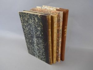 Chateaubriand (François-René de) - Ensemble de 4 volumes in-8° reliés, relatifs à Chateaubriand. - Examen des doctrines de messieurs Fiévée et de Chateaubriand, dans les ouvrages intitulés : histoire de la session de 1815 et de la monarchie selon la charte. Paris, chez les marchands de nouveautés, 1816. Demi-basane marron, dos lisse avec titre doré. Dos insolé. 123 pages. - Extraits critiques du génie du christianisme, par Fontanes. Paris, chez la veuve Richard, An XI. Demi-veau havane moderne, dos lisse avec titre doré. Rousseurs éparses, 64 pages. - Observations critiques sur l'ouvrage intitulé : le génie du christianisme ; par M. de Chateaubriand. Par Chénier. Paris, chez Maradan, 1817. Demi-veau d'époque, dos lisse avec fers à froid et dorés, titre doré. Dos insolé, bon exemplaire, 251 pages. - Coup d’œil rapide sur le génie du christianisme, ou quelques pages sur les cinq volumes in-8°. Paris, imprimerie de la décade philosophique, 1802. Reliure moderne à la Bradel en plein papier à la cuve, dos lisse avec pièce de titre. Rousseurs éparses, 92 pages, exemplaire correct.