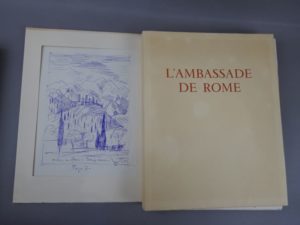 Chateaubriand (François-René de) - L’ambassade de Rome. Paris, La tradition, 1949. 1 volume grand in-4° en feuilles sous chemise et étui. Gravures au burin de Josso. Exemplaire n° 28 avec double état des gravures et un dessin à l’encre bleue signé « C.P.J. » Quelques rousseurs à l'étui, bel exemplaire très propre.