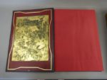 Chateaubriand (François-René de) - Decaris Albert - Combourg. Paris, le fuseau chargé de laine, 1928. 1 volume in-folio, reliure en plein maroquin aubergine, dos à nerfs avec auteur et titre dorés, tête dorée, étui, couverture conservée, reliure parfaitement établie (Gruel). Contreplats doublés de maroquin rouge ; au premier contreplat a été inséré le cuivre original de la gravure de la page 28. Sur ce cuivre a été gravé après l’impression : « à Monsieur Ginier-Gillet, signé Decaris ». Exemplaire n° 151 auquel il a été rajouté une suite sur Chine. La première planche est contresignée, et en début d'ouvrage se trouve une épreuve refusée sur Japon avec envoi de l'illustrateur à Monsieur Ginier-Gillet. Exemplaire parfait sans rousseur.