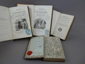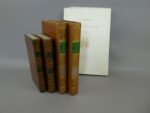 Chateaubriand (François-René de) - Marin Scipion - Histoire de la vie et des ouvrages de M. de Chateaubriand, considéré comme poète, voyageur et homme d'état. Avec l'analyse de ses ouvrages. Paris, chez Vimont, 1832. 2 volumes in-8°, reliure d'époque en plein veau raciné, dos lisses ornés, pièces de titre en veau vert, prune pour la tomaison, tranches marbrées. Bon exemplaire, rousseurs sur certains cahiers du tome 1, cachets de congrégation religieuse sur le faux-titre et titre. On joint : Génie du christianisme, édition abrégée à l'usage de la jeunesse. Paris, imprimerie des frères Mame, 1808. 2 volumes in-12, reliure d'époque, dos lisses avec pièce de titre et de tomaison en maroquin noir. Bon exemplaire, quelques petites restaurations habiles, notamment en coins. Assez rare édition refondue à l'usage de la jeunesse. On joint également de Chateaubriand : Les aventures du dernier Abencérage, illustrées par Daniel Vierge. Paris, chez Pelletan, 1897. 1 volume broché grand in-8°, couverture rempliée. Bel exemplaire sans rousseur, celui-ci n° 190 est l'un des 250 imprimés sur papier du Marais.