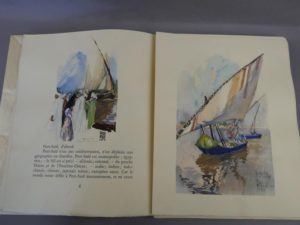Farrère Claude - Fouqueray Charles - Missions et croisières, Mer rouge, Mer de Chine, Océan Indien. Paris, André Barry éditeur, 1944. 1 volume en feuilles sous coffret, couverture rempliée illustrée. Bel exemplaire, dos du coffret en revanche, très fatigué. Superbes illustrations couleur de Fouqueray, sans rousseur. Un des 600 exemplaires sur vélin pur fil du Marais (n°56).