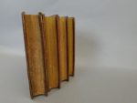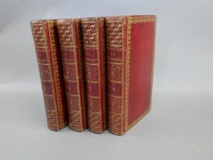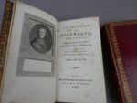 Fénelon (François de Salignac de la Mothe-Fenelon dit) - Les aventures de Télémaque, fils d'Ulysse. Paris, Didot l'Ainé, 1796. 4 volumes in-16, reliure d'époque en plein maroquin rouge, dentelle dorée en encadrement sur les plats, dos lisses avec titre, tomaison et décor dorés, toutes tranches dorées. Petits défauts d'usage en coiffe et coins, sans gravité. Impression sur beau papier, 24 charmantes vignettes, 6 par volumes, dessinées par Quéverdo. Ex-libris de Descle l'Ainé présent sur tous les volumes. Quelques rousseurs entachent cette série bien reliée.