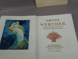Goethe Johann Wolfgang - Leroux Auguste - Werther. Paris, Javal et Bourdeaux, 1928, figures d'Auguste Leroux. 1 volume en feuilles in-4° sous couverture rempliée. Ouvrage tiré à 465 exemplaires celui-ci porte le n°161 et est l'un des 150 comprenant une suite en couleurs d'Auguste Leroux.
