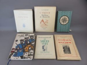 La Varende (Jean de) - Ensemble de 6 volumes brochés de la Varende - Eaux vives, 1 volume petit in-4°, broché sous étui. Paris, la belle édition 1955. Couverture rempliée, illustrations de Raoul Serres, exemplaire numéroté. Très propre. - L'autre île, 1 volume broché in-12, sous étui. Paris chez Jean Crès, 1944. Couverture rempliée, illustrations couleurs de Maximilien Vox. Exemplaire numéroté. Très propre. - L'amour de Monsieur de Bonneville, 1 volume in-4° broché, Paris, Plon, 1955. Couverture rempliée, illustrations de Daniel Loradour, exemplaire numéroté. Très propre. - Princes et manants, 1 volume in-4°, cartonnage éditeur. Paris, Gautier-Languereau, 1960. Très propre. - Le sorcier vert, 1 volume in-8° broché. Rouen, chez Defontaine, 1951. Illustrations de Trividic. Exemplaire correct. - Les châteaux de Normandie (basse Normandie), 1 volume in-8° broché. Rouen, chez Defontaine, 1937. Exemplaire correct. Envoi de l'auteur.