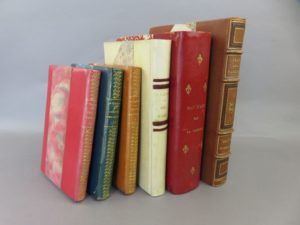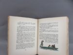 La Varende (Jean de) - Ensemble de 6 volumes reliés de La Varende. - Grands Normands, 1 volume in-4°, Rouen, Defontaine, 1939. Demi-chagrin marron à coins, dos à nerfs avec mosaïque en encadrement dans les caissons, filets dorés, auteur, titre et date dorés, tête dorée. Couverture conservée. Petites usures d'usage. Intérieur propre. Pur fil Lafuma, deuxième papier tiré à 130 exemplaires, n° 70, E. O. - Man d'Arc, 1 volume petit in-4°, Paris, Rombaldi, 1943. Demi-basane rouge, dos lisse avec auteur et titre dorés, tête dorée, fleurs de lys dorées. Couverture conservée. Frottements d'usage. Illustrations couleur de Guy Arnoux reproduites aux pochoirs. Exemplaire numéroté. - Contes sauvages, contes fervents, contes amers, 3 volumes in-12, Paris, Flammarion, 1958. Demi-basane à bandes, marron pour le premier volume, bleu pour le second et vieux rose pour le dernier. Dos lisse avec auteur titre et décors dorés, tête dorée. Dos insolés. Intérieur propre. - Bric-à-brac, 1 volume in-12, Monaco, éditions du rocher, 1952. Reliure à la Bradel, demi-vélin à coins, dos lisse avec auteur et titre dorés, tête dorée. Couverture conservée, exemplaire 114 sur alfa. Bon exemplaire, piqûres sur la tranche.