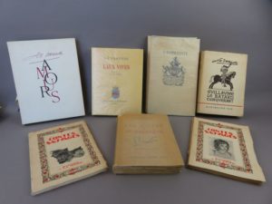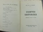 La Varende (Jean de) - Ensemble de 7 volumes brochés de la Varende - Eaux vives, 1 volume petit in-4°, broché sous étui. Paris, la belle édition 1955. Couverture rempliée, illustrations de Raoul Serres, exemplaire numéroté. Le dos se décolle un peu. Très propre. - Amours, 1 volume petit in-4°, broché sous étui. Lille, Danel-Luxe, 1944. Couverture rempliée. Exemplaire correct, couverture un peu brune, quelques piqûres éparses. - Contes sauvages, 2 volumes in-8° brochés. Rouen, Defontaine, 1945. Couvertures illustrées, et dessins de Trividic. Exemplaire modeste avec des rousseurs. - Guillaume le bâtard conquérant. Paris, union bibliophile de France, 1946. Couverture rempliée, exemplaire sur pur fil non numéroté. Correct, quelques petites taches sur la couverture. - Les côtes de Normandie, 1 volume in-8°, Rouen, Defontaine, 1948. Exemplaire modeste, dos fragile. - L'empreinte, 1 volume in-8°, Paris, aux dépens de deux amateurs, 1959. Volume en feuilles non cousues, couverture rempliée, exemplaire 702 sur vergé. Exemplaire correct.