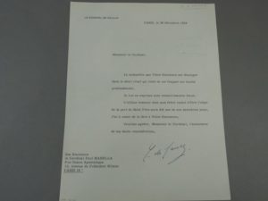 De Gaulle Charles - Lettre tapuscrite et signée par le général de Gaulle, format A4. Lettre datée du 28 décembre 1959 et adressée au Cardinal Marella, au 10 avenue du président Wilson, Paris 16°. « Monsieur le Cardinal, La sympathie que Votre Eminence me témoigne dans le deuil cruel qui vient de me frapper me touche profondément. Je lui exprime mes remerciement émus. L'ultime honneur dont mon frère venait d'être l'objet de la part du Saint Père aura été une de ses dernières joies. J'ai à cœur de le dire à Votre Eminence. Veuillez agréer, Monsieur le Cardinal, l'assurance de ma haute considération. C. de Gaulle. »