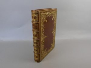 Hamilton Antoine - Mémoires du Comte de Grammont. Paris, librairie L. Conquet, 1888. 1 volume grand in-8°, reliure en plein maroquin havane, décor floral et filets dorés en encadrement sur les plats, dos à nerfs richement orné de fleurons dorés, auteur, titre et date dorés. Toutes tranches dorées sur témoins, contreplat en maroquin vert avec décors dorés en encadrement. Reliure signée David. Couverture conservée. Quelques piqûres sur la tranche et 4 ou 5 piqûres sur les feuillets. Ouvrage tiré à 700 exemplaires, celui-ci 1 des 500 sur papier vélin du Marais. Ouvrage illustré de 33 compositions de Delort et gravé à l'eau-forte par Boisson. Un grand classique dans une belle reliure bien établie.