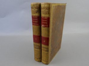 Volney Constantin-François - Voyage en Syrie et en Egypte, pendant les années 1785, 84 et 85. Paris, chez Courcier, 1807. 2 volume in-8°, reliure d'époque en pleine basane racinée, guirlande dorée en encadrement sur les plats, dos lisses richement ornés, pièces de titre et de tomaison en maroquin rouge, toutes tranches dorées. Traces d'usage, petits manques de cuir en coins avec épidermures ; les gardes se décollent des plats. 3 planches dans le volume I ; 5 planches dans le volume II, une planche détachée. 487 et 492 pp. Quelques rousseurs éparses.