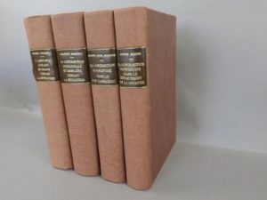 Ensemble de 4 volumes in-4° sur la révolution - Ensemble de 4 volumes in-4° sur la révolution, reliés en pleine toile marron, dos lisses avec pièces de titre en maroquin havane. Dos insolés. - L'assistance publique en France pendant la révolution. Thèse pour le doctorat soutenue par Michel Bouchet. Paris, imprimerie Henri Jouve, 1908. Couverture conservée et restaurée, sans rousseur, VII pp. - 699 pp. - La contribution personnelle et mobilière pendant la révolution par Maurice Minoret. Paris, librairie nouvelle de droit et de jurisprudence Arthur Rousseau, 1900. Couverture conservée, piqûres éparses, 720 pp. - Un impôt sur le revenu sous la révolution, histoire de la contribution patriotique dans le Bas-Languedoc par Pierre-Edmond Hugues. Paris, Honoré Champion, 1919. Couverture conservée, très propre 330 pp. - Un impôt sur le revenu sous la révolution, la contribution patriotique. son fonctionnement dans la province de Lorraine et Barrois puis dans le département de la Meurthe par André Boidin. Paris, Berger-Levrault, 1910. Très propre, XX pp.-342 pp.