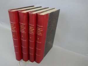Sarot Emile - Les tribunaux répressifs ordinaires de la Manche. Paris, chez Larose et à Coutances chez Salettes, 1882. 4 volumes in-8°, reliure du temps en demi-chagrin rouge, dos à nerfs avec auteur, titre et tomaison dorés. Rares petits défauts d'usage sur les coupes et en coins. Rousseurs éparses. Bon exemplaire, série complète peu courante.