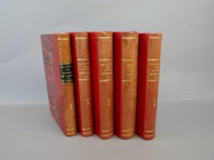 Le Goffic Charles - La Bretagne et les pays celtiques, l'âme bretonne. Paris, chez Honoré Champion, 1911/1924 4 volumes in-12, reliure moderne en demi-basane rouge, dos lisses avec auteur, titre et hermine dorés. Couvertures conservées. Dos passablement insolés, bon état. Complet des 4 premières séries, quelques reproductions de photos N B. On joint, de Charles le Goffic, 1 volume in-12, dans une reliure similaire : Contes de l'Armor et de l'Argoat, Paris édition Spes, 1928. Illustrations en noir de Jubier. Envoi de l'auteur sur le faux-titre à Jean des Cognets.