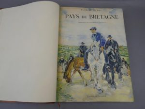 Méheut mathurin - Le Roy Florian - Pays de Bretagne. Paris, Editions Alpina, 1937. EO. (n°187) . 1 volume grand in-4°, reliure demi-basane à coins renforcés, dos à nerfs, auteur et titre dorés, couverture conservée en un seul tenant, 25 cm x 34,5 cm, 155 pages, 12 hors-texte couleur, photos noir blanc in et hors-texte en héliogravure. Texte de Florian Le Roy, aquarelles de Mathurin Méheut. Rousseurs, frottement d'usage sur les mors. Bon état.