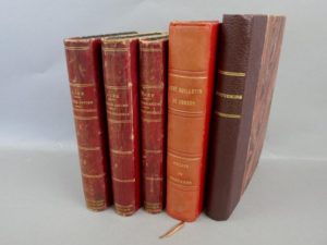 Ogée Jean-Baptiste - Marteville A - Rennes ancien, Rennes moderne, ou histoire complète de ses origines, de ses institutions et de ses monuments. Rennes, chez Deniel et Verdier, s.d. (circa 1860). 3 volumes in-12, reliure d'époque en demi-basane rouge, dos lisse avec auteur, titre et filets dorés. Reliure légèrement frottée, une coiffe abîmée. 1 planche dépliante. On joint : Abbé Guillotin de Corson Récits de Bretagne, Rennes, chez Plihon, 1889. 1 volume in-12, reliure moderne en demi-basane rouge, dos lisse avec auteur et titre dorés. Dos insolé. Première et deuxième séries reliées en 1 volume, couverture conservée pour la première série 300 puis 334 pp. On joint un second volume : 1 volume in-12, reliure milieu XXème, en demi-percaline marron, dos lisse avec titre « souvenirs » comprenant 4 titres : - Plaine, lettre au Cardinal Place. Rennes, librairie générale de l'ouest, 1891. - P. de Valamont, La vérité sur la colonie de Port-Breton et sur le marquis de Rays. Nimes, chez Lafare, 1889. - Plihon, Pastorale pour Noël, Rennes chez Francis Simon, 1898. - Kérambrun, les profiteurs de la libération. Rennes imprimeries réunies, circa 1945. Coupures de presse in-fine. Soit 5 volumes.