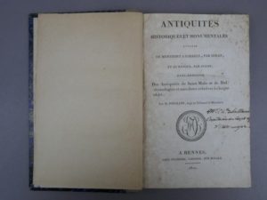 Poignand (Jean Côme Damien) - Antiquités historiques et monumentales à visiter de Montfort à par Dinan et au retour par Jugon avec addition des antiquités de Saint-Malo et de Dol, étymologies et anecdotes relatives à chaque objet. Rennes, chez Duchesne, 1820. 1 volume in-8°. Reliure demi-percaline bleue. Pièce de titre en maroquin noir, dos insolé. Reliure modeste. 154 pages + table alphabétique de 26 pages. Texte de M. Poignand, ex-libris de Olivier du Breil de Ponbriand Marzan, sur la page de titre, nom à l’encre du premier propriétaire illisible (capitaine au corps d’état-major). Quelques passages soulignés sinon bon état.