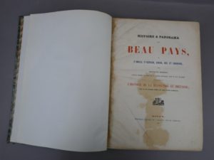 Robidou Bertrand - Doutreleau Valentin - Histoire et panorama d'un beau pays, ou St-Malo, St-Servan, Dinan, Dol et ses environs. Dinan, imprimerie Bazouges, 1861. 1 volume in-folio, reliure début XXème en demi-basane verte, dos lisse avec auteur, titre, et fleurons dorés. Usure de la coiffe, dos insolé. Couverture conservée, avec une tache s'amenuisant pour disparaître à la page 21. 430 pages et 1 feuillet de table ; rares rousseurs. 5 grandes lithographies en noir hors-texte.