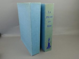 Vercel Roger - Fouqueray Charles - La pêche en mer. Paris, éditions Celbi, 1962. 1 volume grand in-4°, sous chemise et étui bleu de l’éditeur. Dos de la chemise légèrement jauni, quelques petits défauts à l’étui. Exemplaire n° 323 sur grand vélin d’Arches, feuillets très propres excepté quelques rousseurs pâles au faux-titre. Superbes illustrations couleur de Charles Fouqueray, reproduites à la main par Roger Nervet. Bon exemplaire.