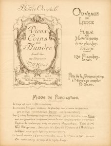 Vieux coins en Flandre. 2e série. 120 planches lithographiques originales par Armand Heins. Préface de Paul Bergmans. Gand, N. Heins, 1904, in-folio, [14]-III-[1] p. (titre, préface, table), 120 planches, certaines imprimées sur papier gris ou vert amande, l'ensemble sous couv. de livraisons, et portefeuille éditeur demi-toile grise (portefeuille défraîchi, lacets manquants, rabats usés, intérieur frais). Tirage limité à 250 exemplaires. 4 f. de prospectus joints.