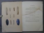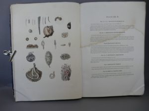Lamarck (Jean-Baptiste Pierre Antoine de Monet de) Delessert Benjamin - Recueil de coquilles. Paris, chez Fortin, Masson et Cie, 1841. 1 volume in-folio reliure d'époque à la Bradel en papier bleu, dos lisse avec pièce de titre en basane marron. Reliure défraîchie, manque de papier par endroits, mors fendu, chasses et coins abîmés. Ouvrage collationné et complet des 40 planches couleur rehaussées à la main. Volume entaché d'une forte mouillure sur son ensemble, parfois moins visible sur les planches que sur le texte mais bien présente. Exemplaire modeste.