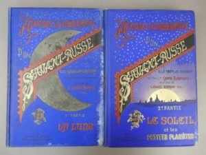 Le Faure Georges Graffigny (Henry de) - Aventures extraordinaires d'un savant russe. Paris, Edinger, 1889. 2 parties en 2 volumes : 1ère partie « la lune », 2ème partie « le soleil », grand in-8° en cartonnage bleu de l'éditeur. Décor polychrome sur les plats. Décoloration importante le long des coupes biseautées sur les premiers plats.