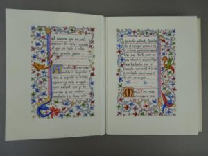 Livre d'heures manuscrit sur vélin - Livre d'heures manuscrit sur peau de vélin. 1 volume in-12, reliure contemporaine en vélin sous étui, enluminure datée de 1936 insérée dans le premier plat, dos lisse avec décor et titre en couleurs. « Œuvres de Pierre Hutier 1896 1981 » indiqué sur la page de titre. 108 pages de texte calligraphié entouré d'un décor dans l'esprit des livres d'heures ; chaque feuillet est différent. Une quinzaine de pages restent inachevées. Joli travail d'une grande fraicheur.