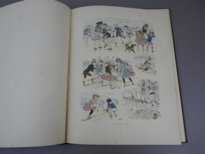 Mars (Maurice Charles Mathieu Bonvoisin dit) - Aux Bains de mer d'Ostende. Paris, Plon, S.D. (circa 1890). 1 volume in-4° en cartonnage éditeur, pleine percaline marron foncé avec décor en noir et doré. Bel état du cartonnage malgré des ors un peu passés. Quelques rousseurs éparses mais l'album reste plaisant. On joint 2 autres cartonnages ; - Le Chevaler Beau-Temps par Quatrelles illustré en noir par Gustave Doré. Paris, Typographie Pougin, 1870. 1 volume in-8°, percaline beige avec titre en noir sur le premier plat. Quelques taches et frottements. Cahiers propres avec de très rares piqûres, édition originale. - Les joies du plein air par Grosclaude illustré en noir par Caran d'Ache. Paris, Plon, S.D. (circa 1890). 1 Album oblong in-8°, bel état, quelques rousseurs, sans plus. Soit 3 volumes